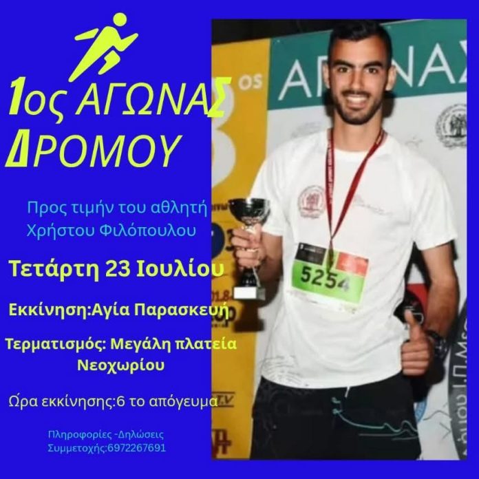 • Την Τετάρτη 23 Ιουλίου θα διεξαχθεί ο 1ος Αγώνας Δρόμου εις μνήμην του αθλητή Χρήστου Φιλόπουλου, που έφυγε ξαφνικά από τη ζωή σε ηλικία μόλις 25 ετών, τα ξημερώματα της Πέμπτης 10 Απριλίου.