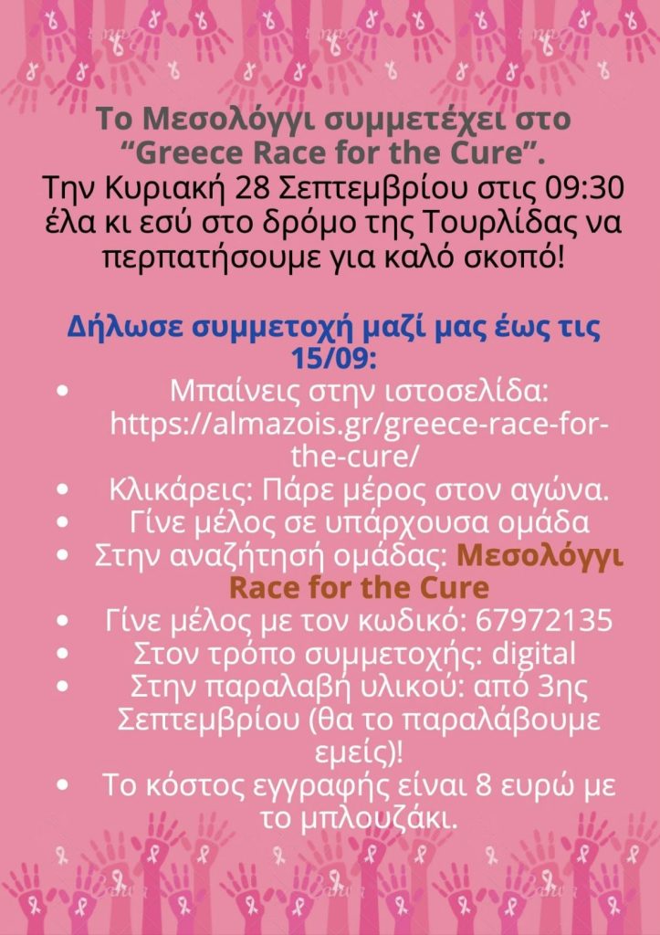 Την Κυριακή 28 Σεπτεμβρίου στις 09:30, το Μεσολόγγι βάζει τα αθλητικά του και κατεβαίνει στον δρόμο της Τουρλίδας για έναν πολύ σημαντικό λόγο: να περπατήσουμε όλοι μαζί στο πλαίσιο του “Greece Race for the Cure”, της μεγαλύτερης διοργάνωσης ενάντια στον καρκίνο του μαστού.
