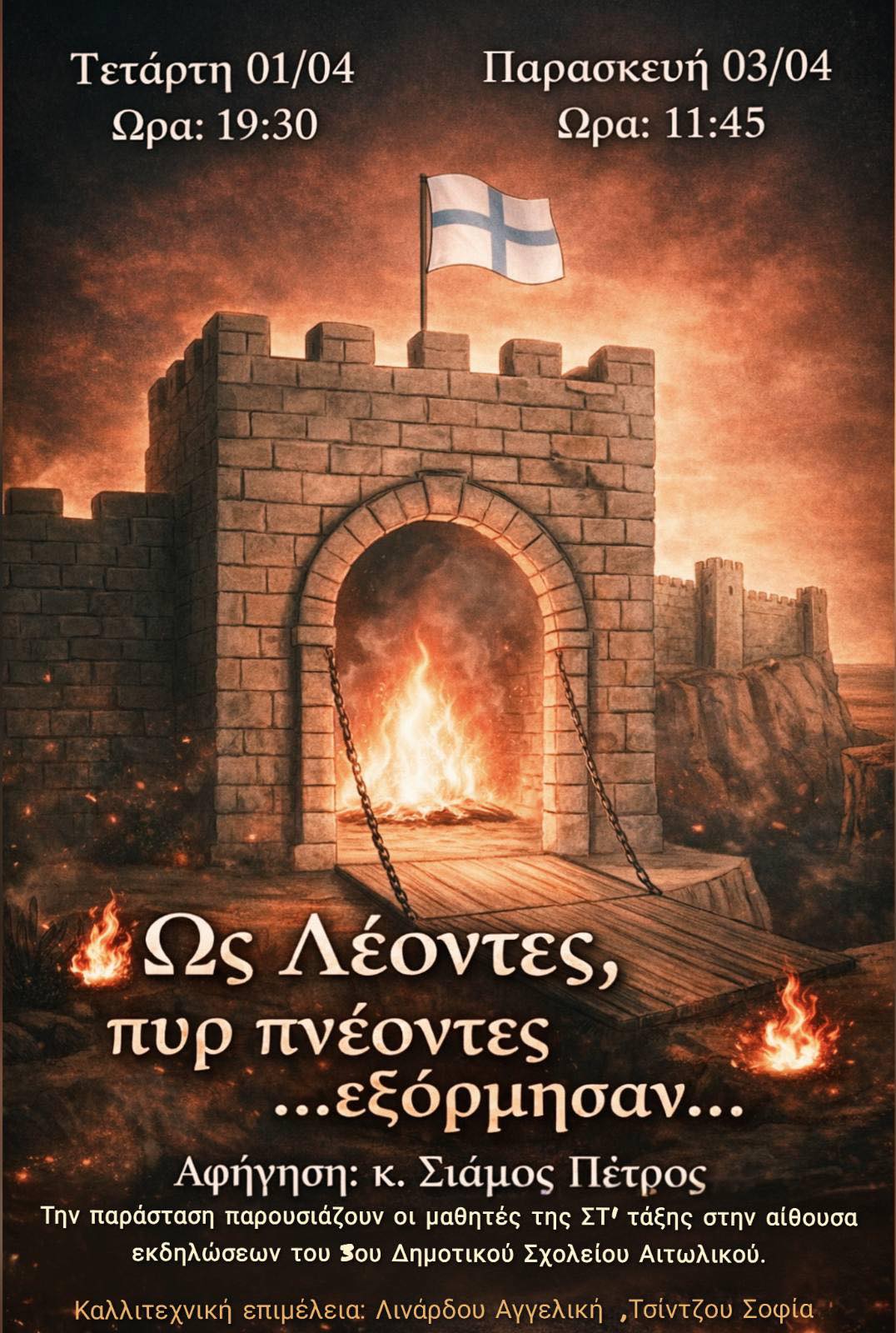Σε αυτή την παράσταση, τα παιδιά της Στ᾽ τάξης του τρίτου δημοτικού σχολείου Αιτωλικού, με συνοδοιπόρο τον κ. Πέτρο Σιάμο, αγαπημένη φωνή-σύμβολο των Εορτών Εξόδου στο Μεσολόγγι, μπαίνουν σε έναν κόσμο γεμάτο ένταση, επιλογές, δύναμη και μνήμη, και μέσα από αυτή τη διαδρομή μας θυμίζουν τι σημαίνει να συνεχίζεις, να στέκεσαι όρθιος και να προχωράς ακόμα κι όταν όλα γύρω δυσκολεύουν.
